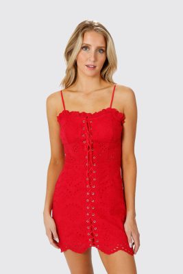 Elsa Lace Up Eyelet Mini Dress – Red
